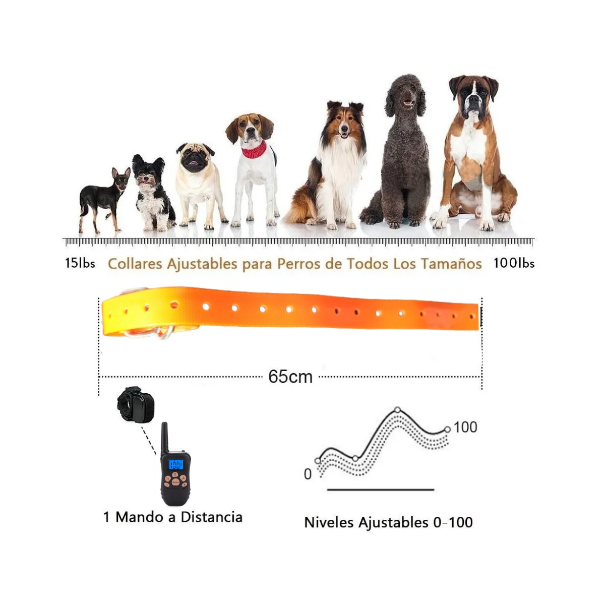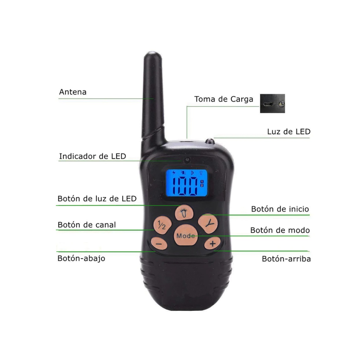 - Trabaja hasta 300 metros de alcance Transmisor y collar resistente al agua.