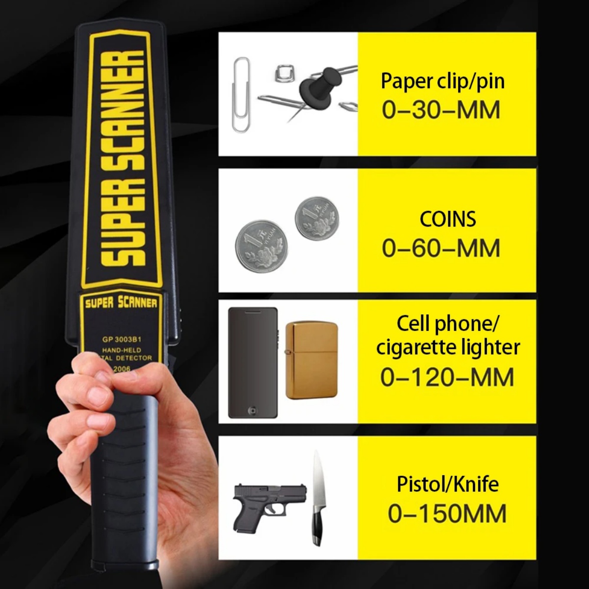 - Máxima sensibilidad: detecta una pistola de tamaño mediano desde una distancia de 23 cm; un cuchillo grande desde 15 cm; hojas de afeitar y cúteres a 7,6 cm de distancia; medicamentos envueltos en papel de aluminio y pequeñas joyas a 2,5 cm.
