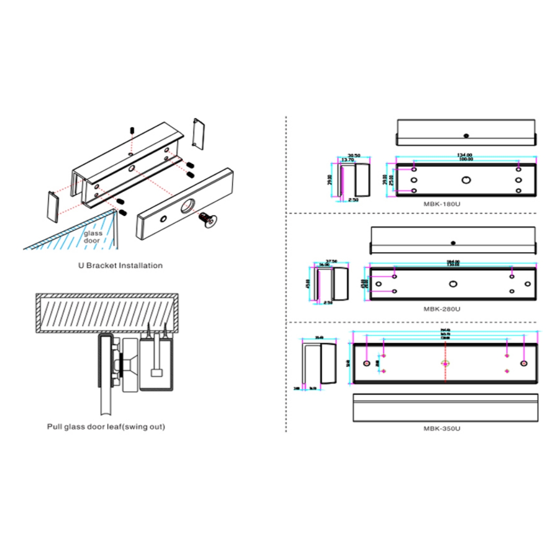 Resistente soporte de aluminio en forma de U para magnéticos de 350Lbs, Adecuado para puertas de vidrio sin marco.