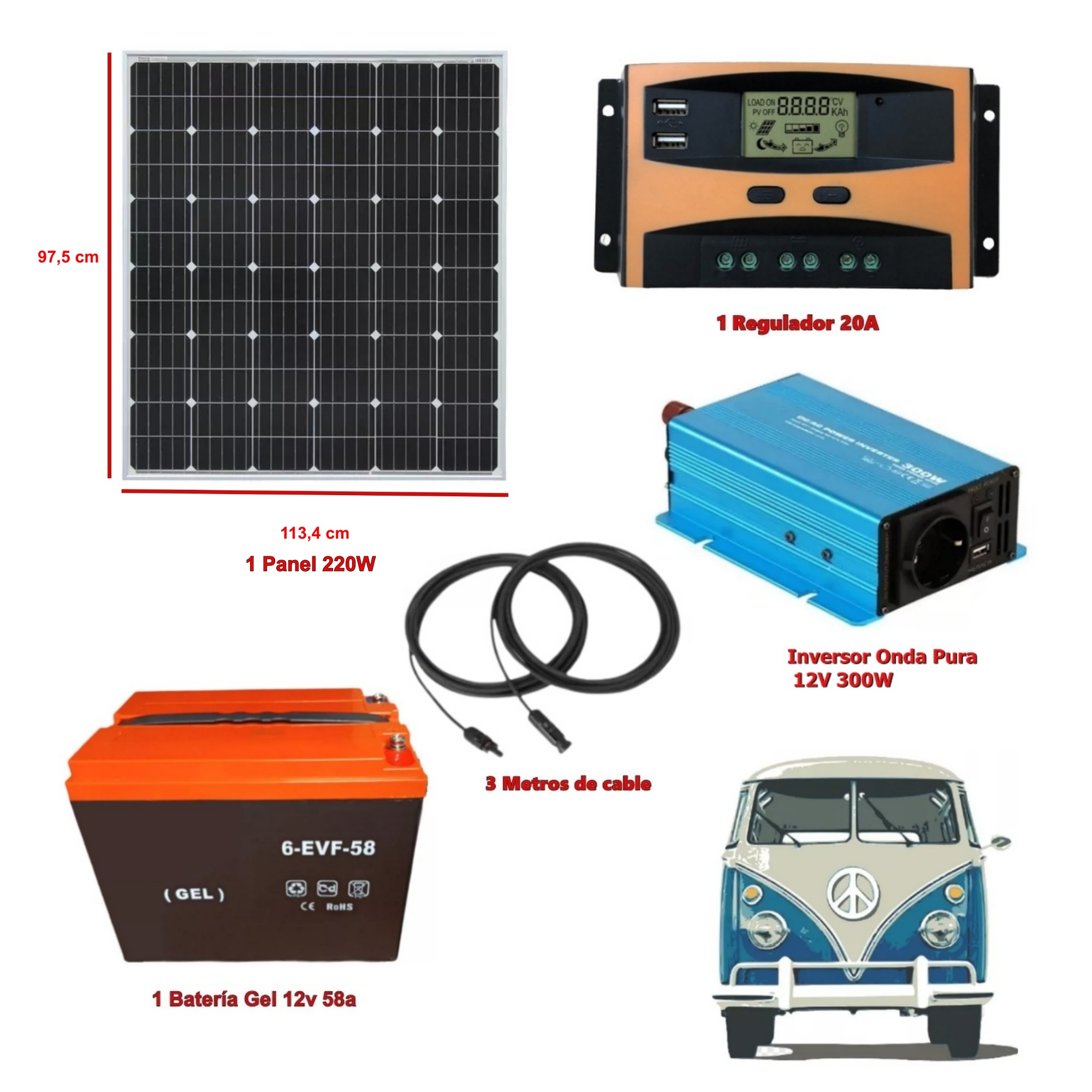 Abi Tecnología le ofrece un Kit Combi. Este kit te permitirá tener cargados celulares, Parlantes de audio, utilizar la Notebook, Bomba de agua, picos de luz y más.
