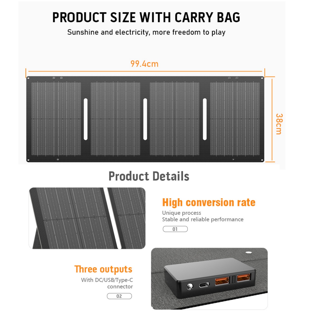 Los paneles solares portátiles de 2,60 W tienen una eficiencia de conversión de hasta el 20,5 %, lo que reduce la pérdida de luz y mejora la eficiencia de la celda. En comparación con el panel solar promedio, la tasa de generación de energía es mayor.